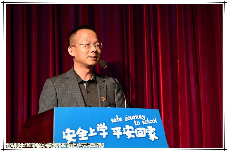 在北京的清华附小CBD实验小学活动现场,主办单位负责同志在讲话中介绍了儿童道路安全工作进展情况,倡导共同致力于儿童道路交通安全。